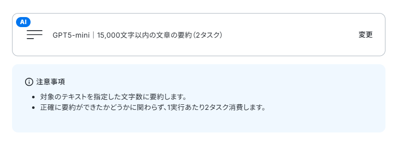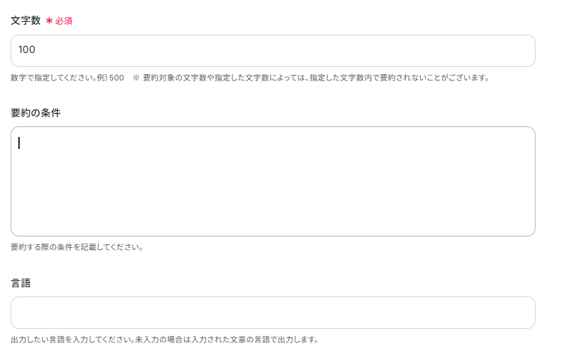 AI機能でテキストを生成するアクションでは、要約の形式や文字数など、アウトプットしたい内容に応じてプロンプト(AIへの指示)を任意で設定してください。 ■注意事項