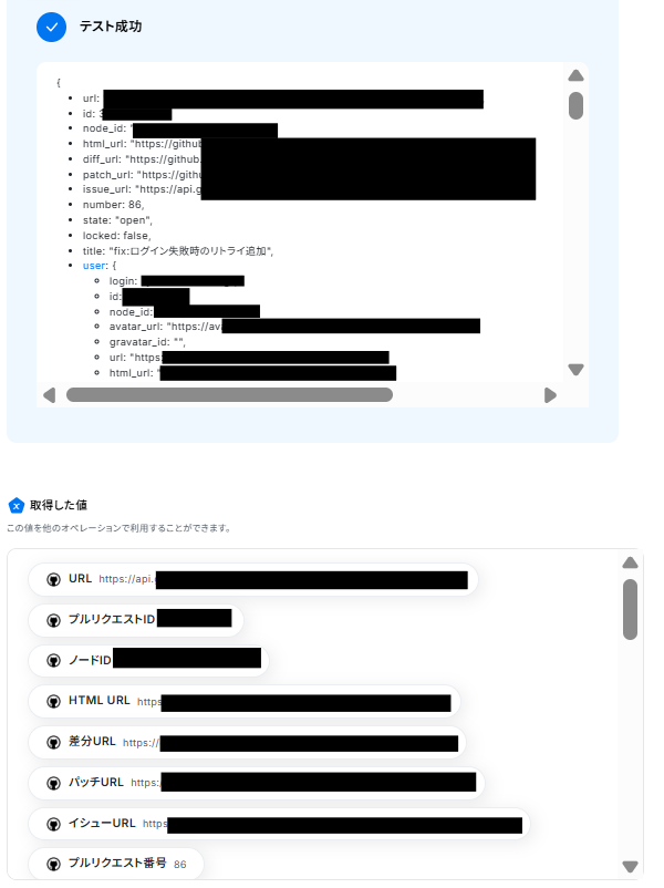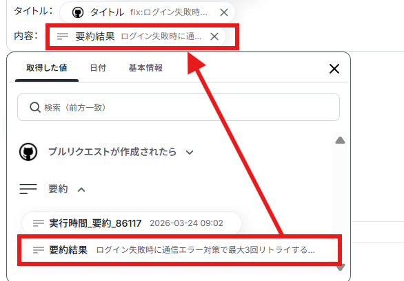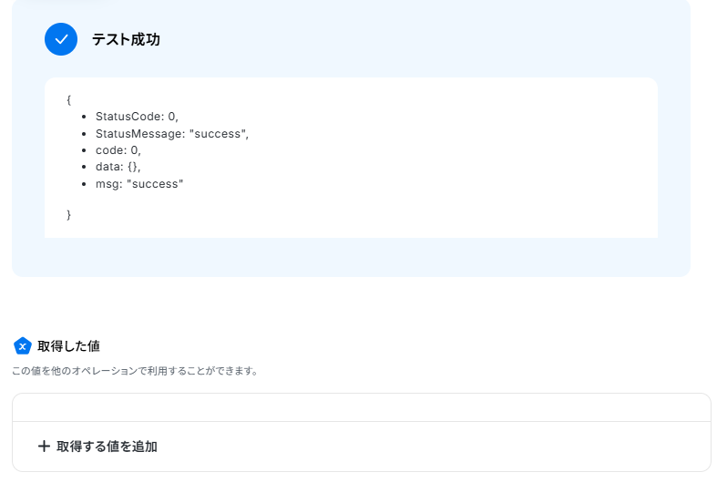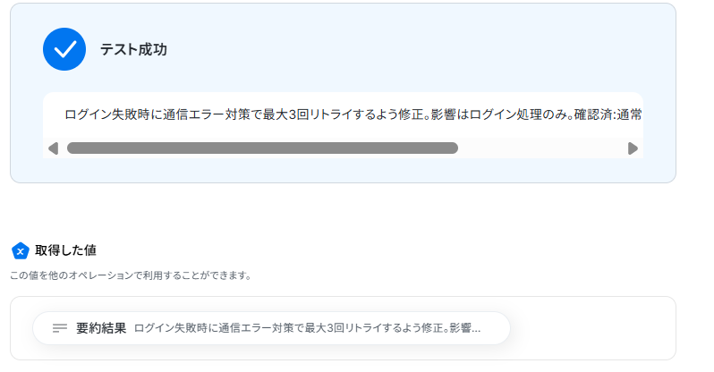 ここまで設定したらテストボタンをクリックしてください。テストが成功し、要約された内容が取得した値に入ります。