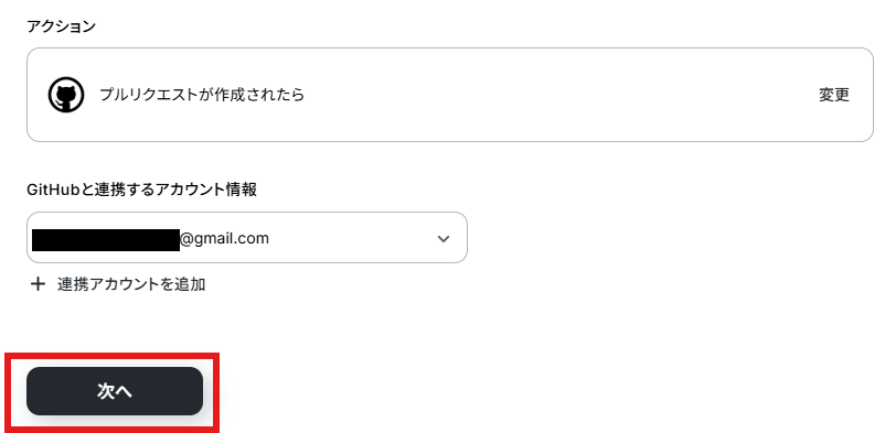 アクションはデフォルト設定のまま、アカウント情報は、連携したいアカウントが選択されているか確認してください。確認が終わったら「次へ」で進みましょう。