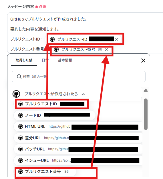 メッセージ内容はデフォルト設定の通り、前ステップで取得した値を使い以下のように入力しています。