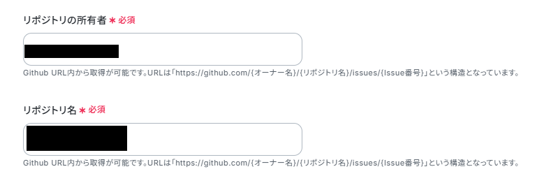 GitHubのトリガー設定では、監視対象としたいリポジトリの「オーナー名」と「リポジトリ名」を任意で設定してください。 GitLabでイシューを作成するアクションでは、同期先の「プロジェクトID」や、GitHubから引き継ぐ「課題のタイトル」「課題の説明」などを任意で設定してください。 ■注意事項