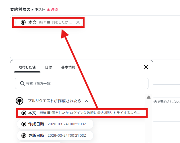 AI機能の「テキストを要約」オペレーションでは、要約対象のテキストをプルリクエストのタイトルや本文など、任意の値に設定することが可能です AIに与える指示(プロンプト)も自由に設定できるため、「変更点を箇条書きで」や「100文字以内で」といった、要約の条件を任意にカスタマイズできます ■注意事項