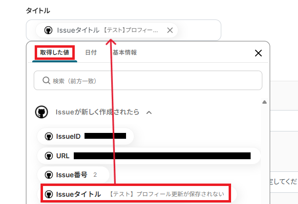 「タイトル」は、取得した値から選択できます。