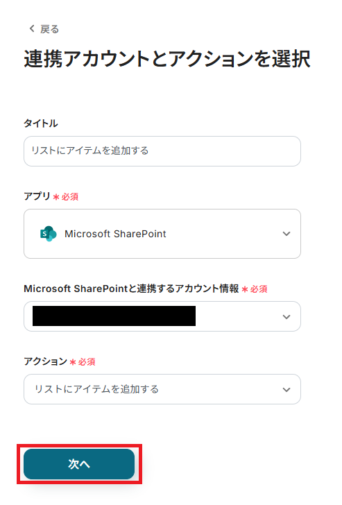 ステップ4:Microsoft SharePointのアクション設定