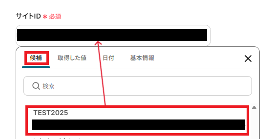 「サイトID」は、ボックスをクリックすると連携済みのサイトIDが表示されるので、使用したいサイトIDを選択してください。