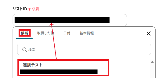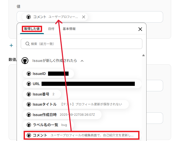 「値」は、取得した値からフィールドに合わせて選択しましょう。