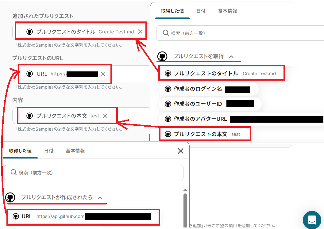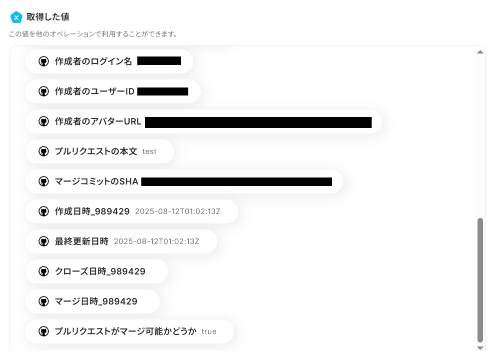 「取得した値」を使用して、プルリクエストの詳細情報から「作成者のログイン名やユーザーID」、「プルリクエストの状態」といった情報をNotionデータベース上に更新できます。