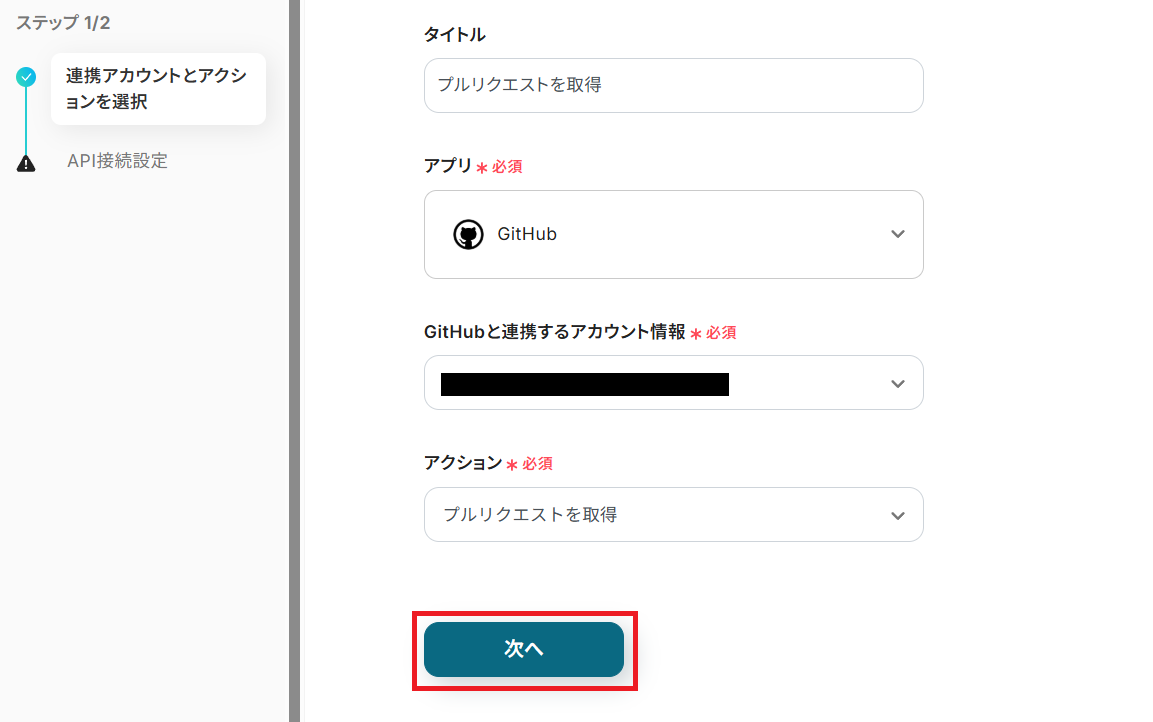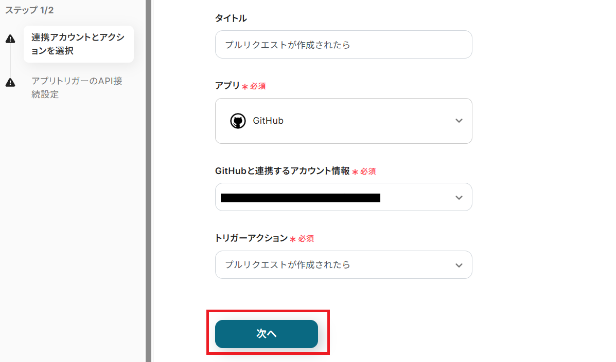タイトルを任意で設定し、GitHubと連携するアカウントやアクション内容を確認したら「次へ」を押してください。