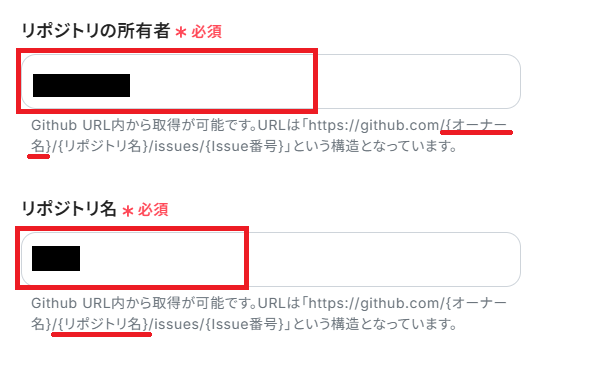 次に、「リポジトリの所有者」と「リポジトリ名」を入力していきましょう。