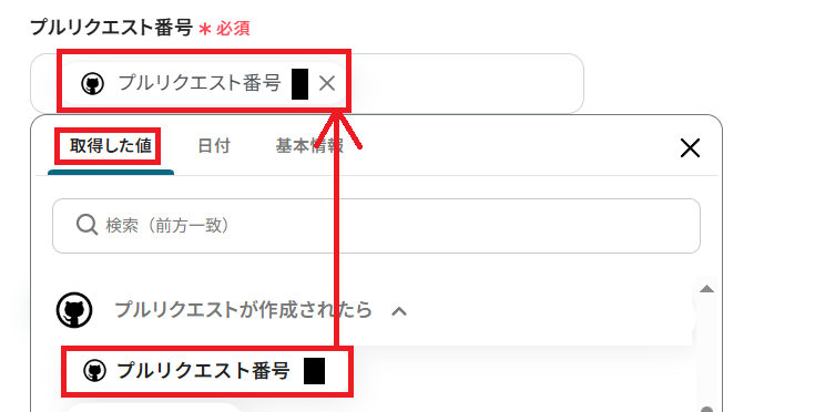 次に入力する「プルリクエスト番号」は、前ステップで取得した値から「プルリクエスト番号」を選択してください。