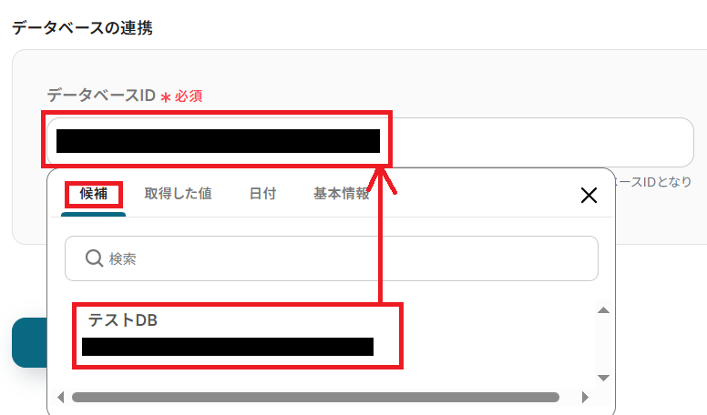 Notionアカウントと上手く連携できていれば、ボックスをクリックするだけで「候補」にNotionのデータベースが表示されるため、任意のものをクリックしましょう。