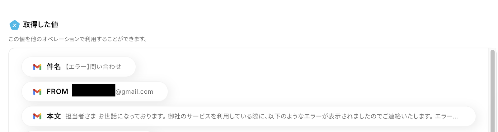 テストに成功すると「取得した値」としてGmailの内容がアウトプットされます。