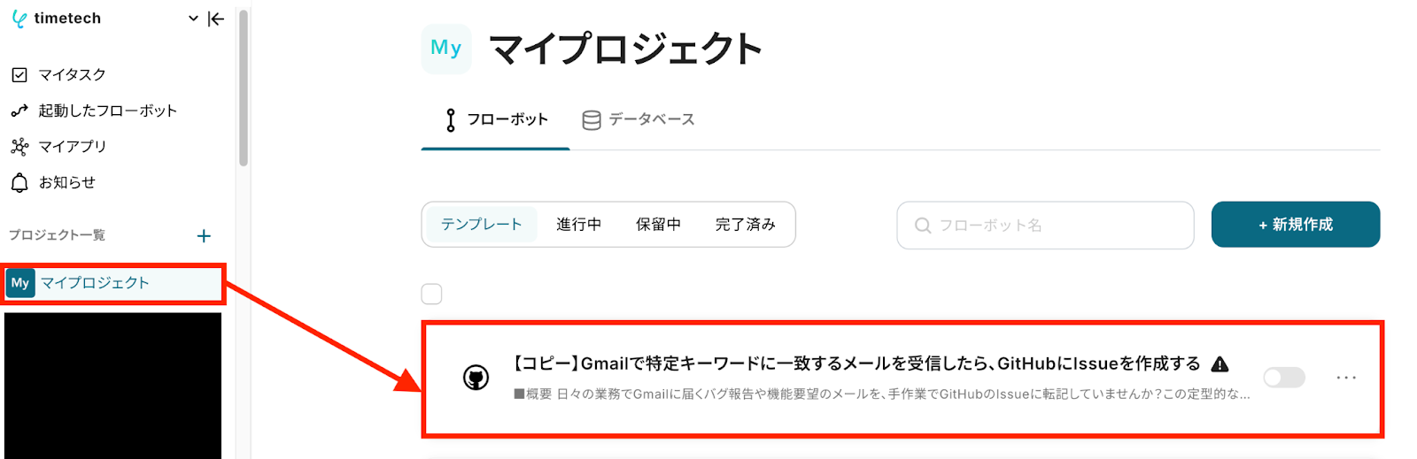 左側にあるメニューの「マイプロジェクト」から、コピーしたテンプレートを開きます。