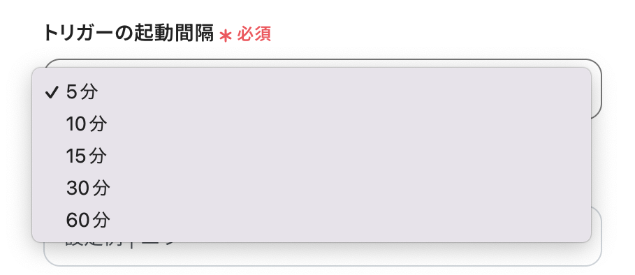 「トリガーの起動間隔」を5分・10分・15分・30分・60分から選択します。