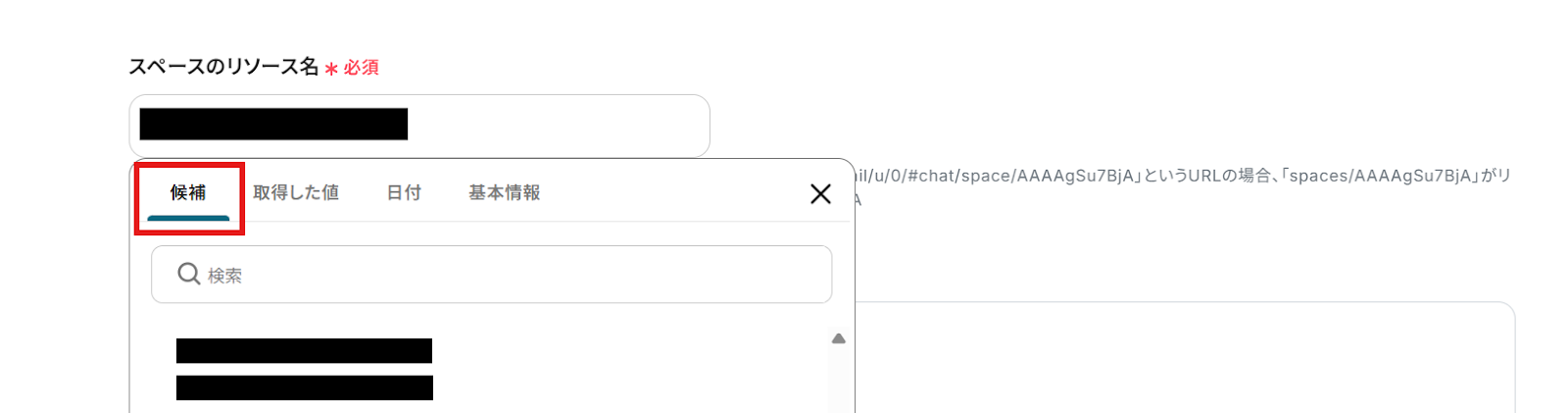 スペースのリソース名:入力欄をクリックすると、候補が一覧で表示されます。その中から目的に合うものを見つけて、選択してください。
