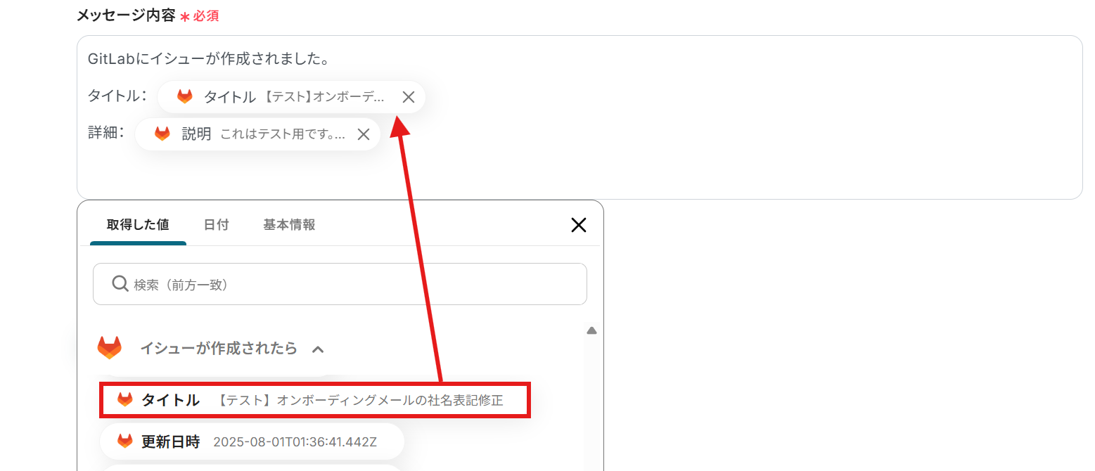メッセージ内容:編集欄をクリックすると、以下のようにGitLabで取得した情報を引用できます。メッセージ作成の際には活用してくださいね。