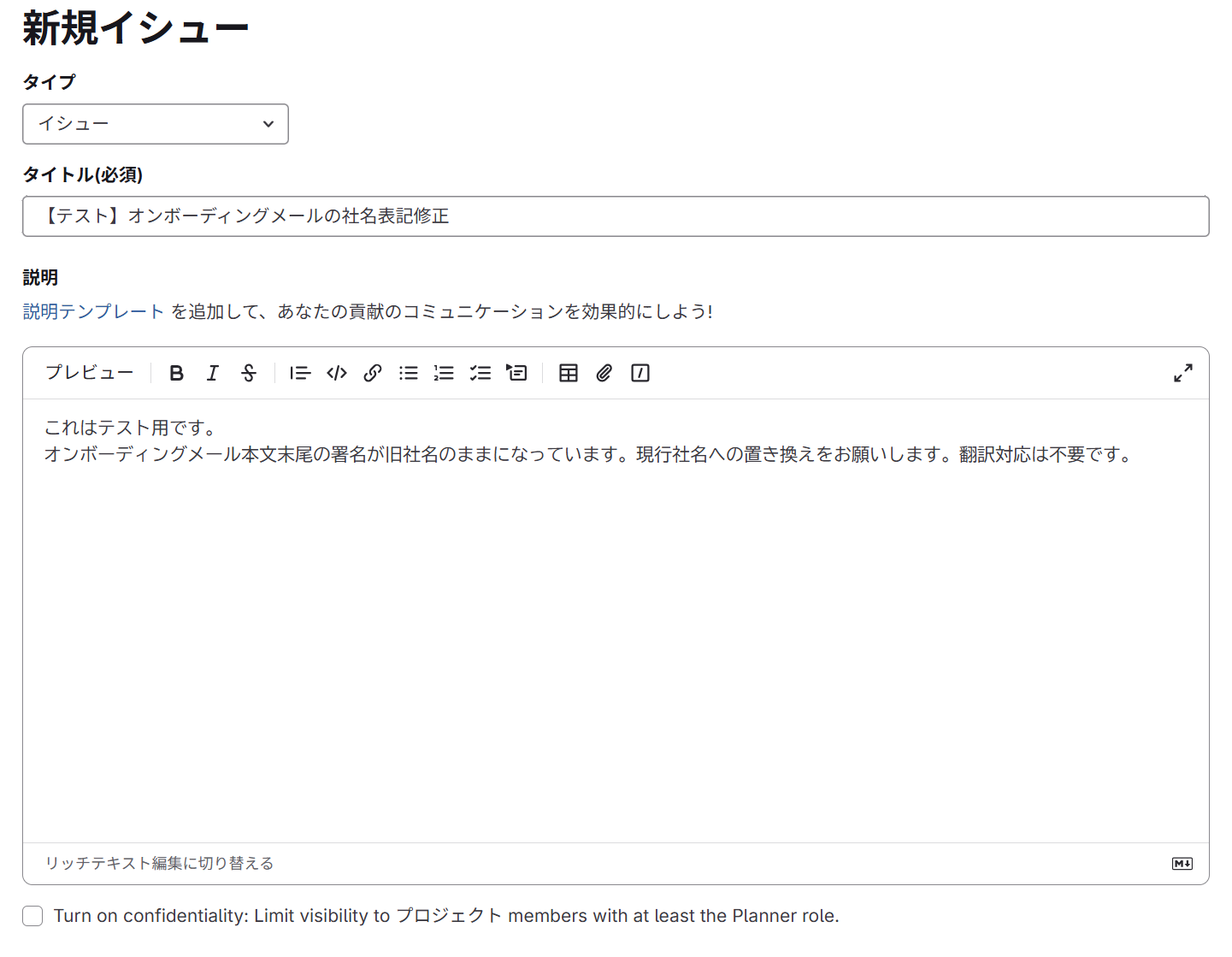 設定が終わったら、テストのためGitLabの画面でイシューを作成します。