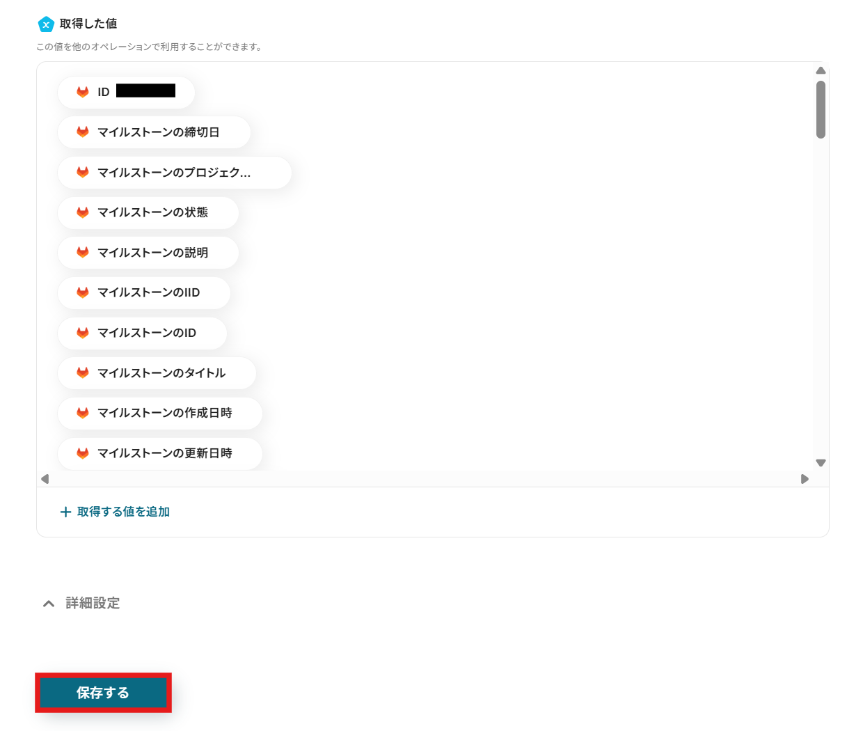 今回は値が入っていませんが、実際はテストが成功すると、「テスト成功」という画面が表示され、GitLabから取得した情報を引用できるようになります。