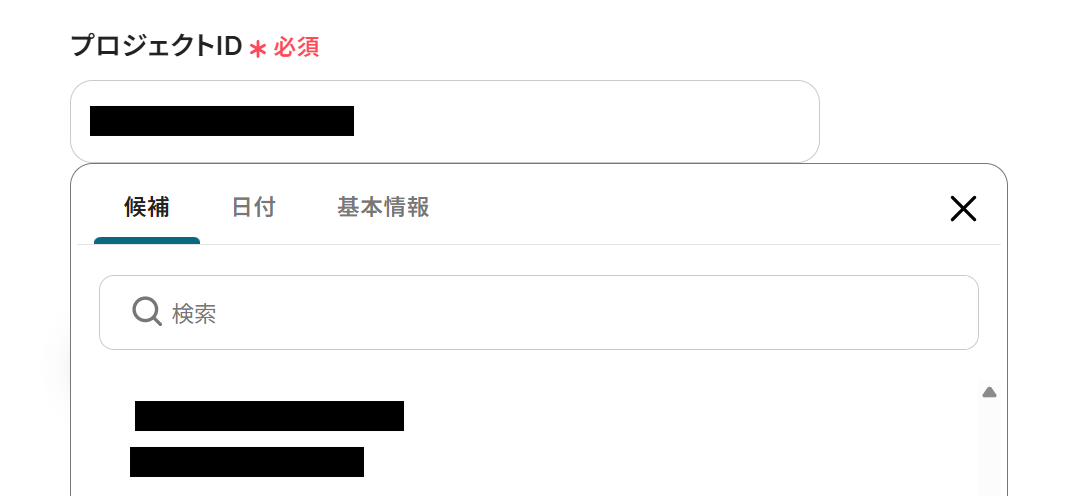 プロジェクトID:入力欄をクリックすると候補が表示されるので、その中から選択しましょう。もし候補がうまく表示されない場合は、マイアプリ連携の設定をもう一回チェックしてみてください。また、こちらの記事も参考にしてみてくださいね。