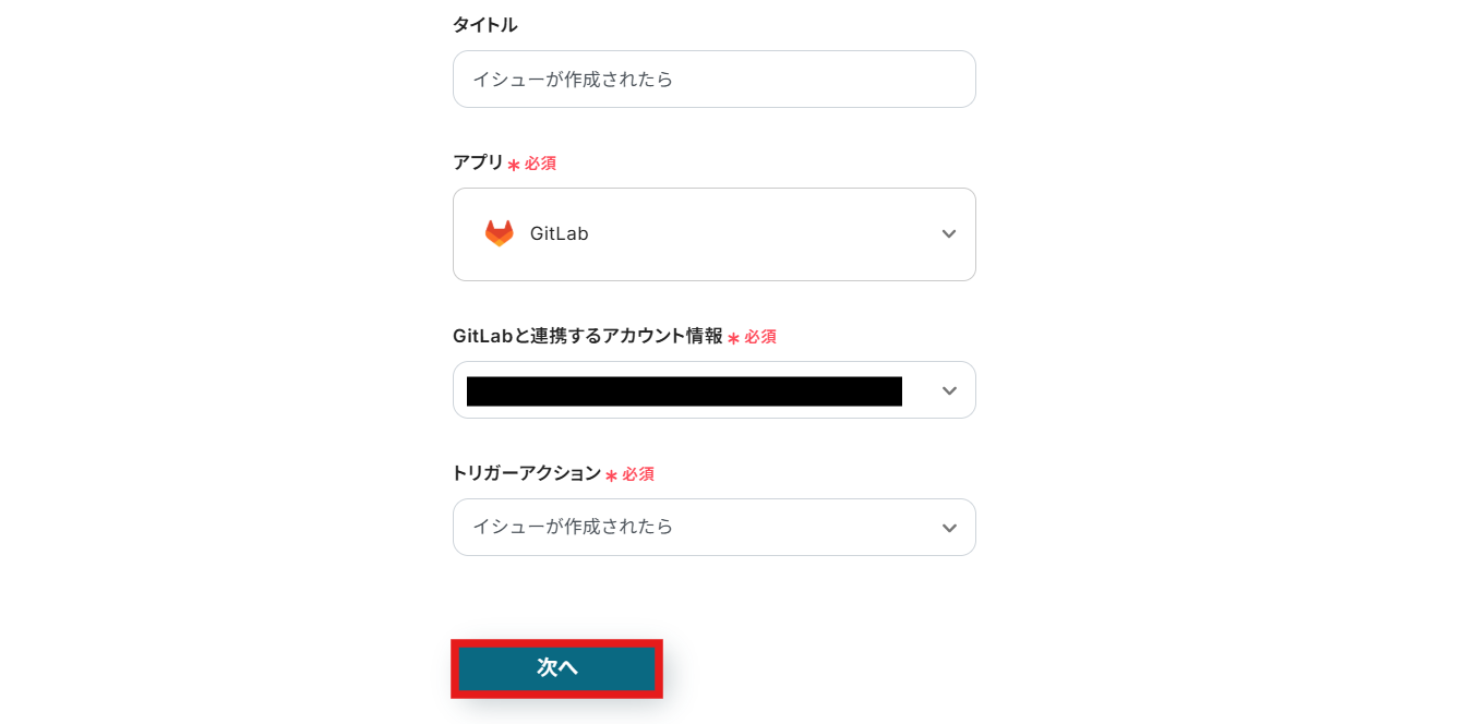 GitLabと連携するアカウント情報はプルダウンから選択します。基本的にマイアプリ登録で連携したアカウントが選択されています。