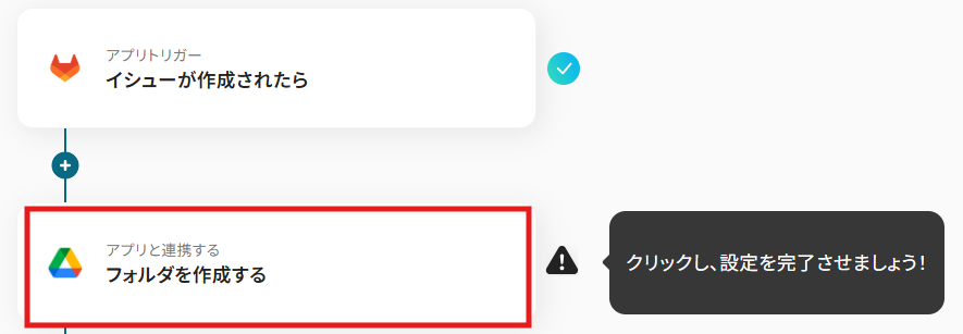 クリックすると以下の画面に移ります。 GitLabのときと同様ステップ1で設定したアカウント情報が記載されているはずです。 トリガーアクションは「フォルダを作成する」のままで次に進みましょう