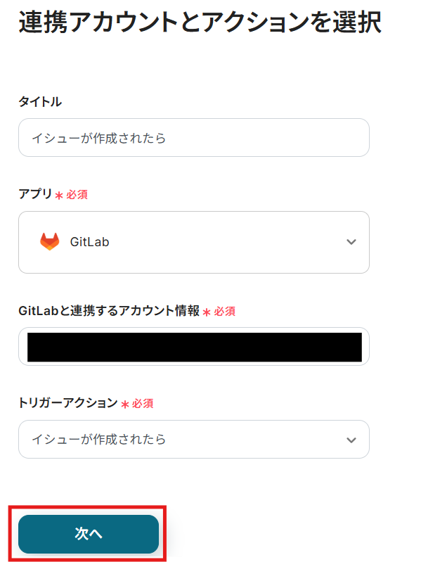 クリックすると以下の画面に移ります。 アカウント情報と書かれた項目にはステップ1でマイアプリ連携した際の情報が記載されています。 トリガーアクションは「イシューが作成されたら」のままで次に進みましょう!