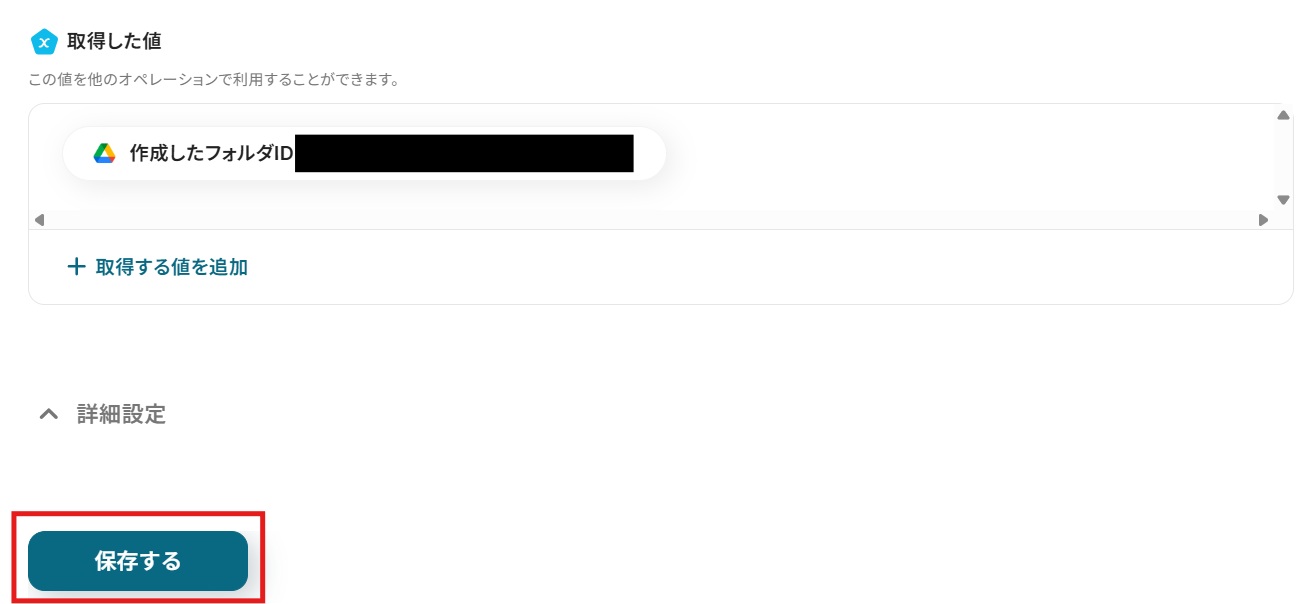 次に、Google Driveにフォルダを作成する設定を行います。 「フォルダを作成する」をクリックしてください。