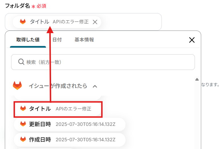 Google Driveに作成するフォルダ名を入力します。 編集欄をクリックし、「イシューが作成されたら」から「タイトル」を選択します。