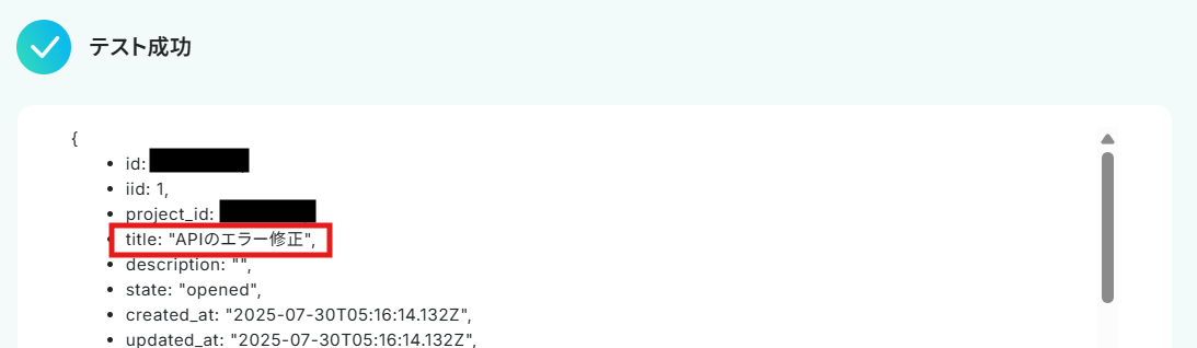 イシューを作成した後、Yoomの画面に戻り、テストを実行してください。 テストが成功し、作成したイシューの情報が表示されたら、「保存する」をクリックして完了です!