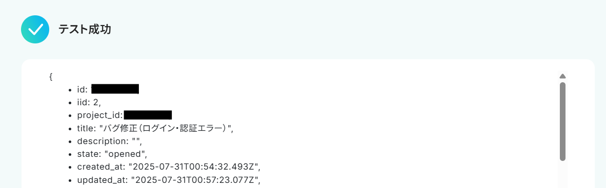テストが成功し、更新したIssueの情報が表示されたら、「保存する」をクリックして完了です!