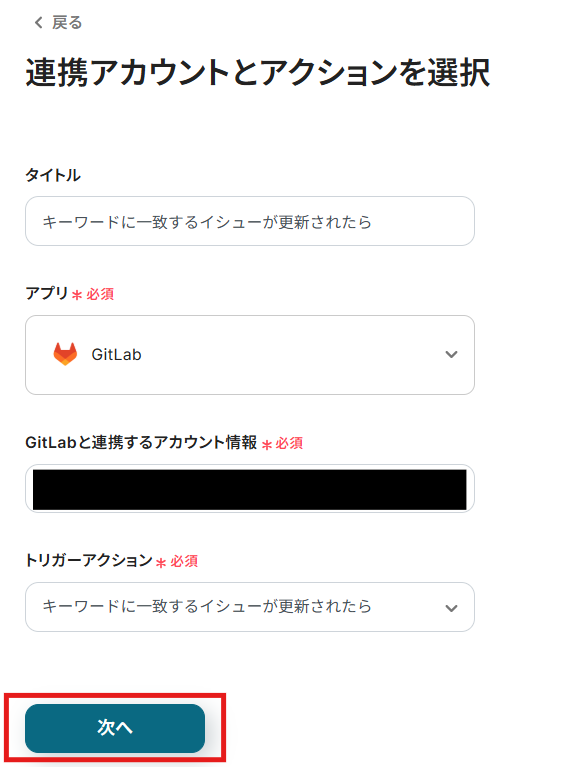 アカウント情報の項目にはステップ1でマイアプリ連携したGitLabのアカウント情報が自動で表示されます。