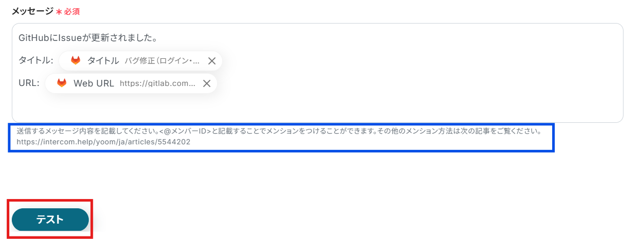 ・メッセージ:任意のメッセージを入力します。以下のように①で取得した値を埋め込むことも可能です。(アウトプットを埋め込む)