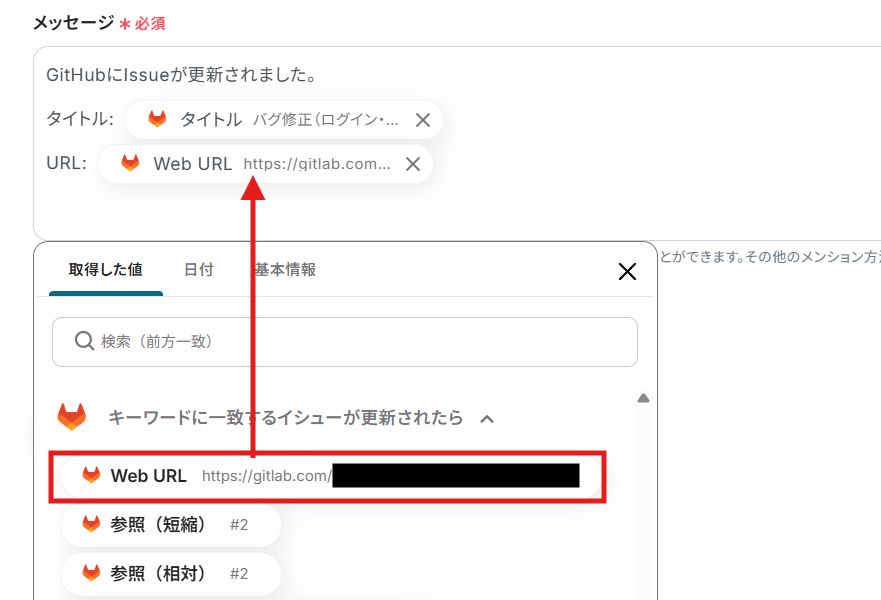 テキストボックスをクリックして、「キーワードに一致するイシューが更新されたら」からGitLabの情報を引用できます!
