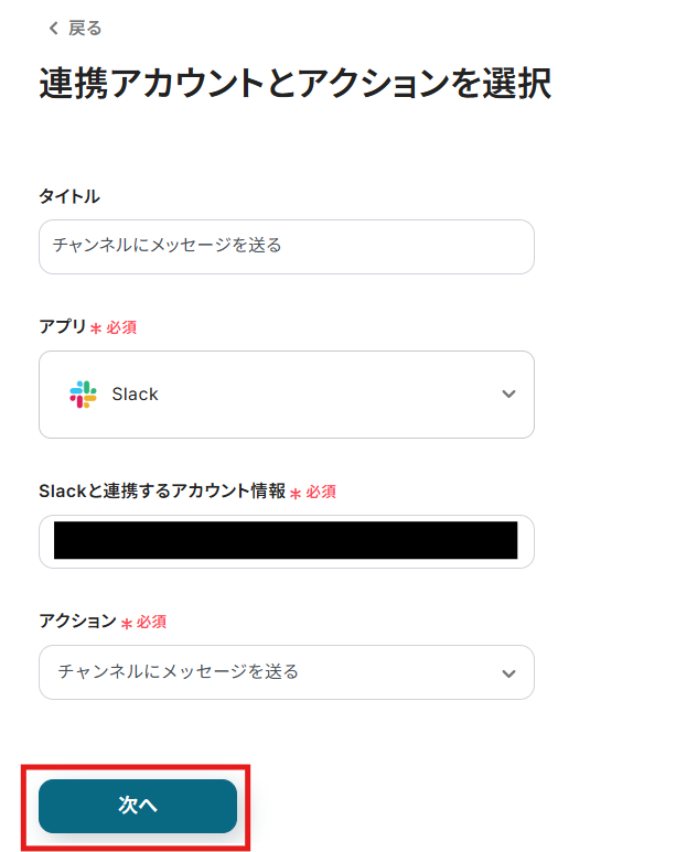 GitLabと同様に、ステップ1でマイアプリ連携したSlackのアカウント情報が自動で表示されます。