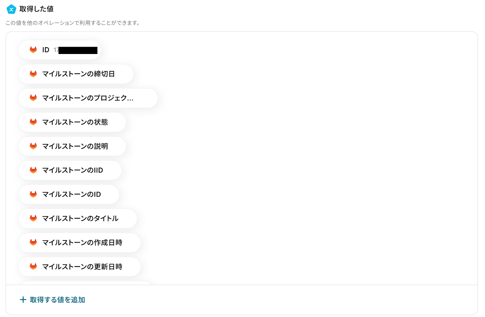 ここで取得した値を、後のアクションで利用します。