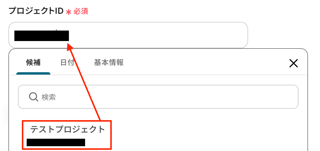 - 「プロジェクトID」:入力欄をクリックして表示される候補から選択します。