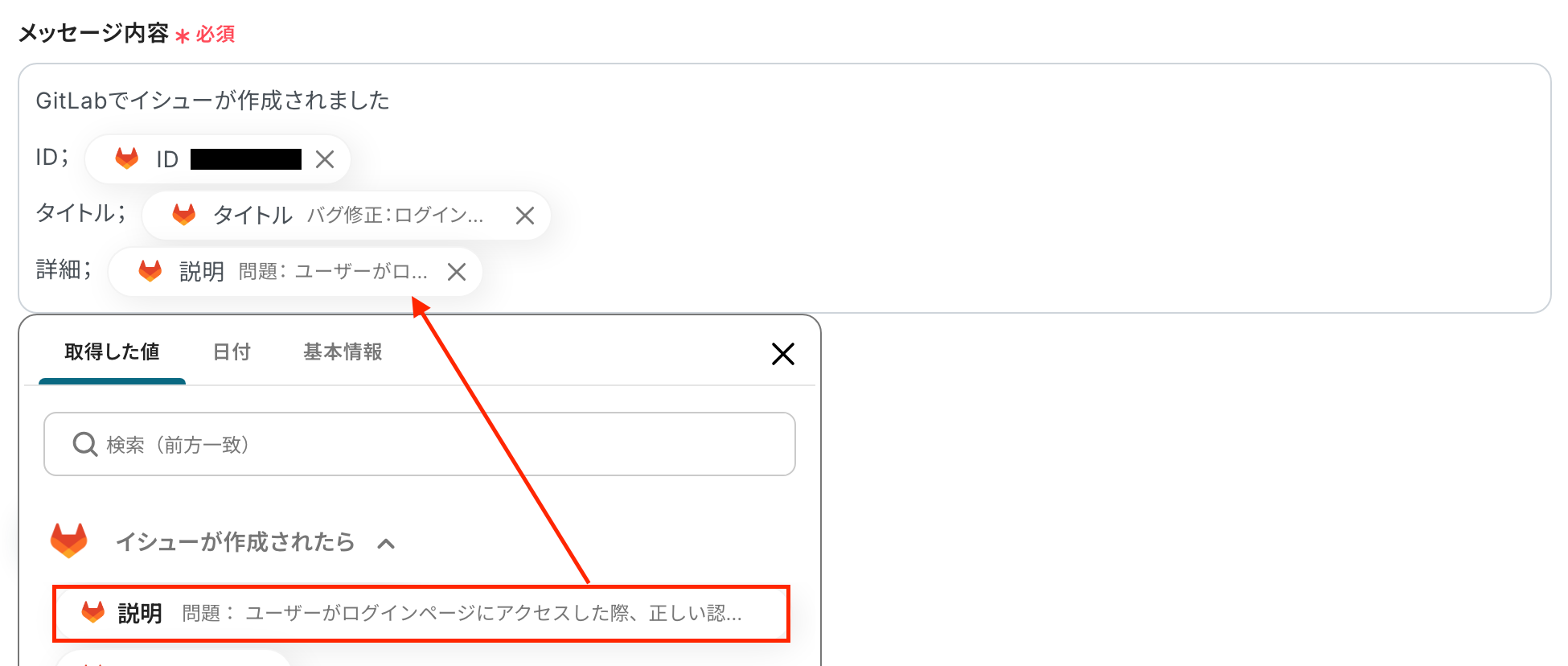 - 「メッセージ内容」:Telegramへ通知する際の内容を設定します。以下の画像のように取得した値から選択することで、GitLabの情報を引用することができます。