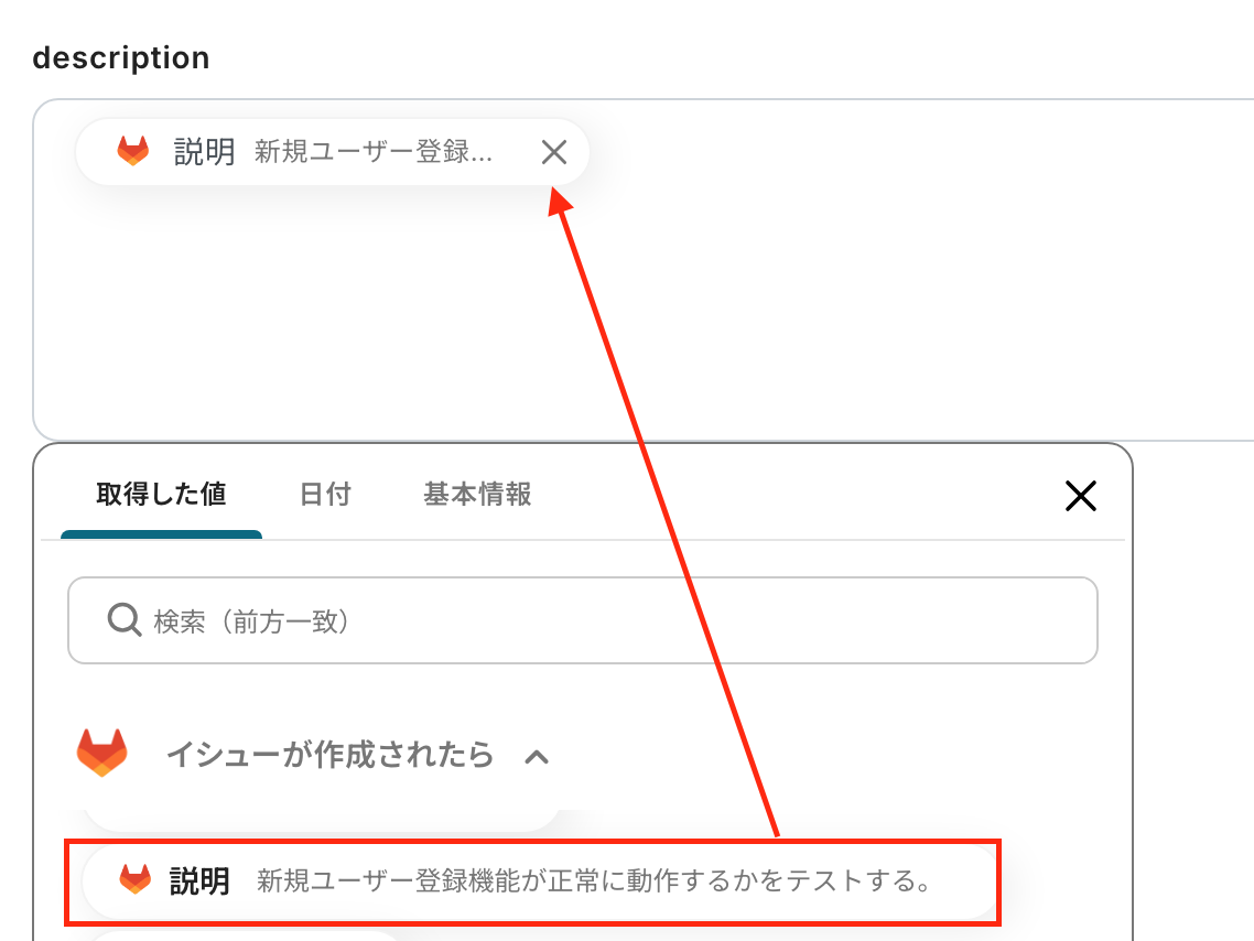 「description」:アウトプットを引用して、タスクの詳細を設定します。任意の文章と組み合わせて自由に設定してください。