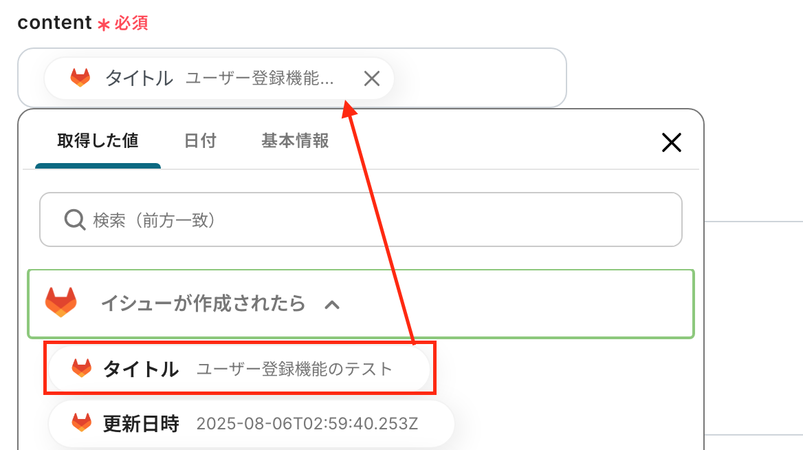「content」:入力欄をクリックして表示されるアウトプットを引用して設定します。ここでは、「タイトル」を設定しました。
