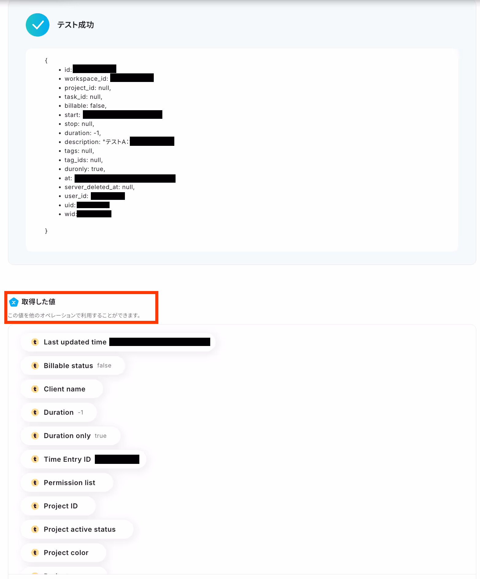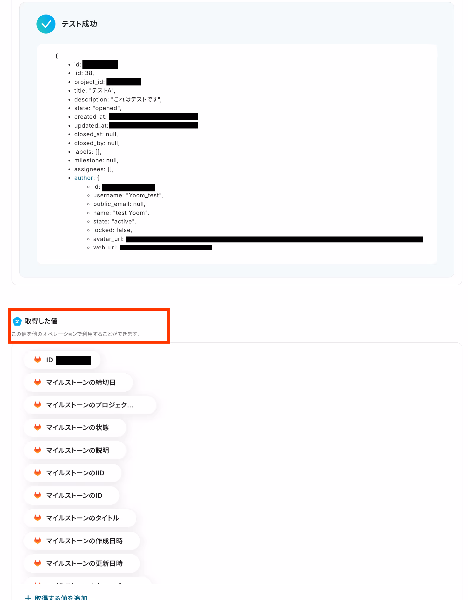 「テスト成功」と表示が出たら、取得した値にデータが反映されます。