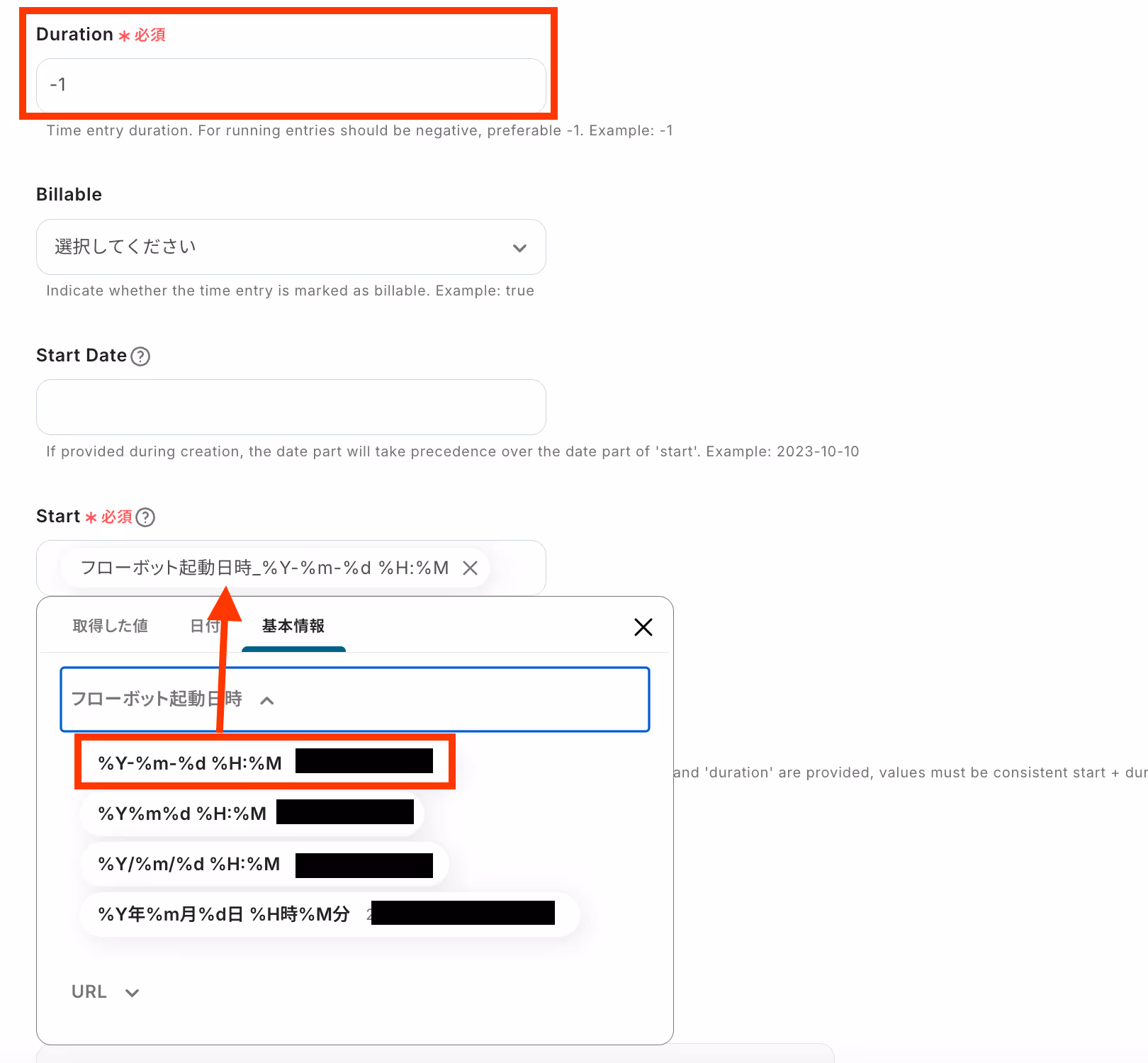 Time Entryの長さ「Duration」と「Start」を設定します。