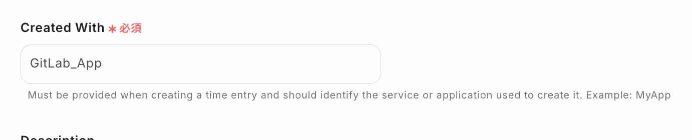 Time Entry を作成するときに使うパラメータの要件である「Created with」を任意の名称で設定します。