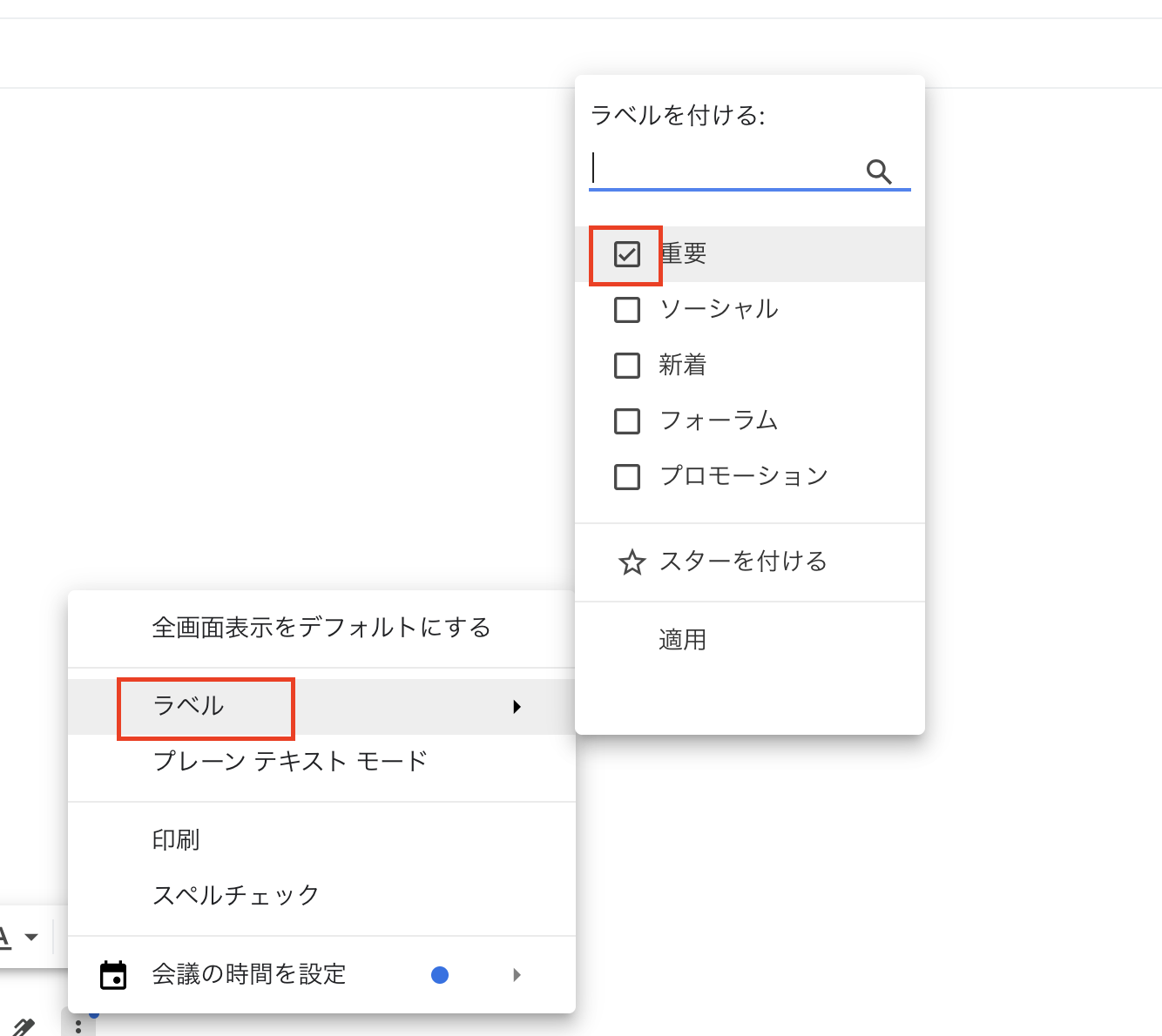 ラベルはメールを新規作成をクリックしたら下の3点リーダーを選択します。