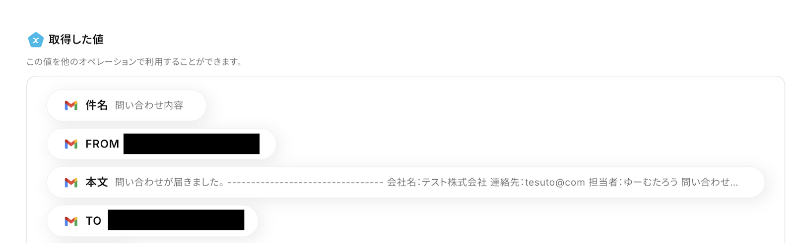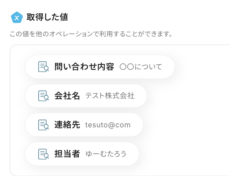 メール内容を手入力してしまうと、同じ内容から繰り返し抽出することになりますので、取得した値を活用しましょう。