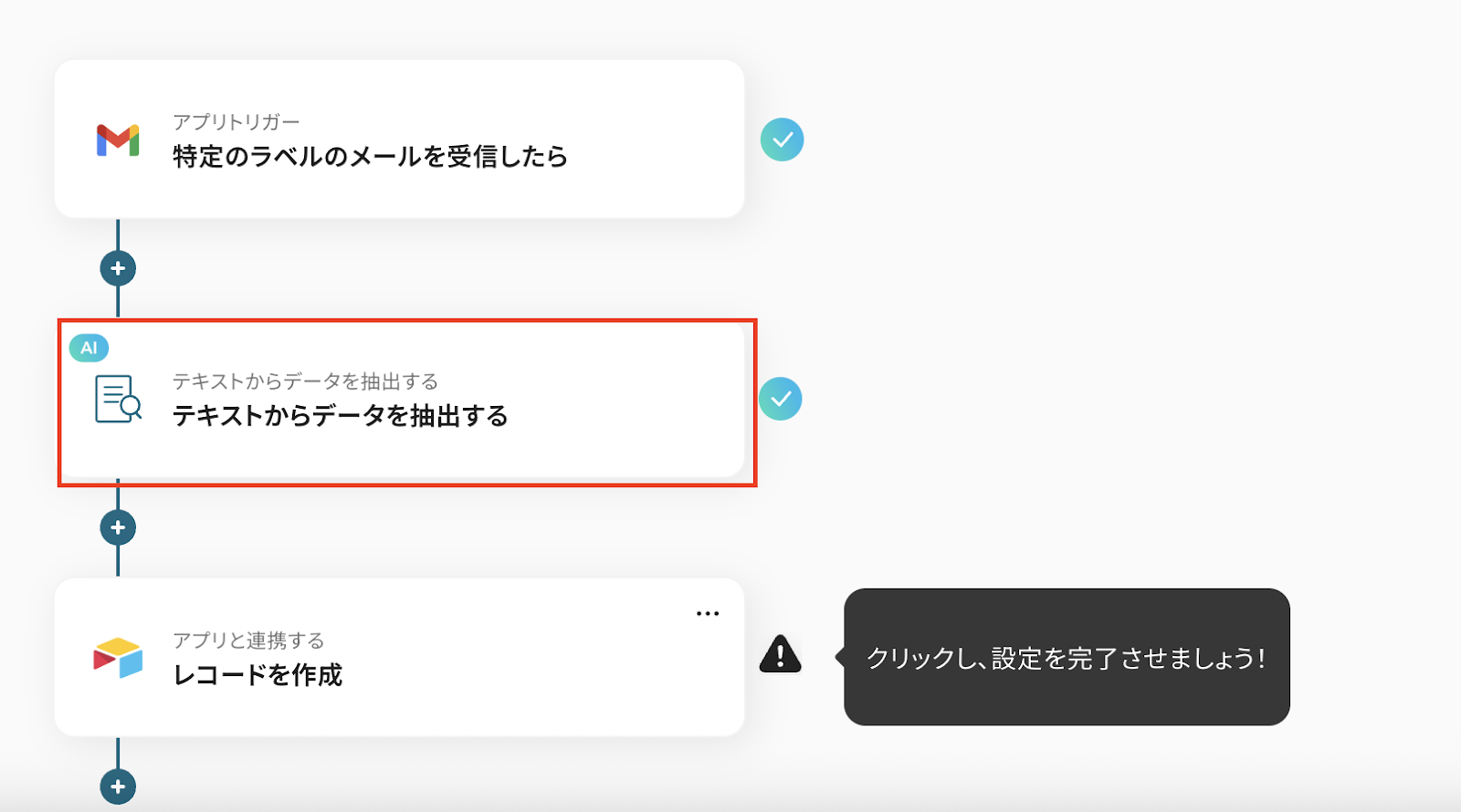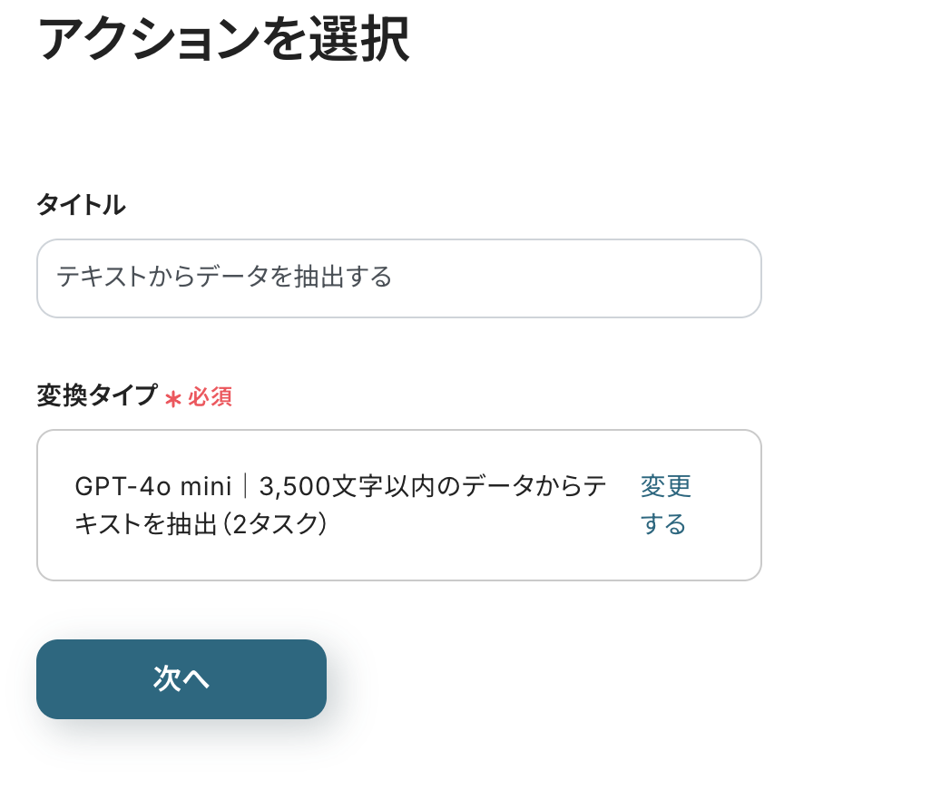 このアクションでは、Gmailで受信した内容からAirtableに登録したい項目を抽出するために行います。
