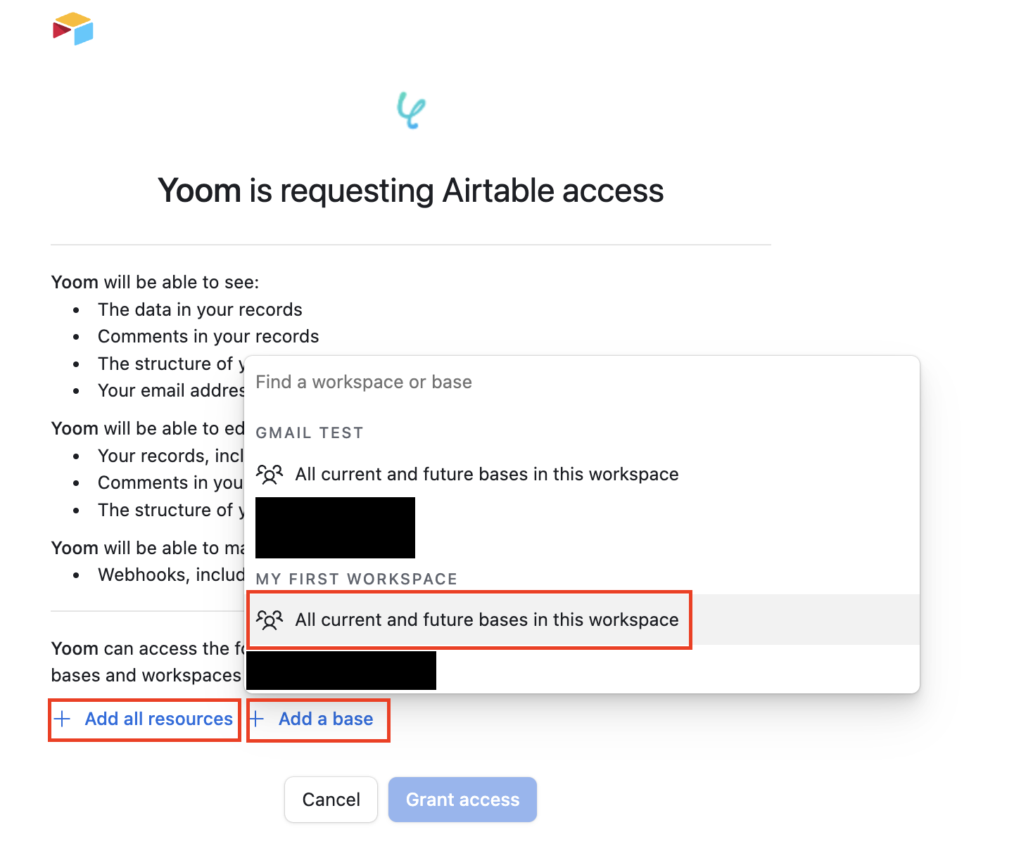 もしすべてのベースを連携する場合は、「All current and future bases in this workspace」をクリックして、「Grant access」を選択します。