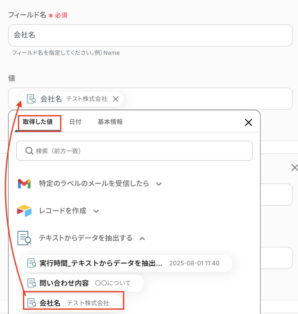 値には、テキストからデータを抽出の取得した値から選択してください。