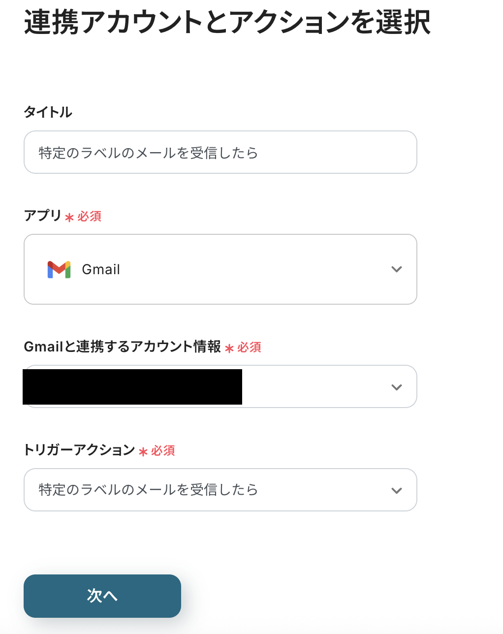連携アカウントとアクションを選択の画面は設定ができているので、以下を確認したら「次へ」をクリックしましょう。
