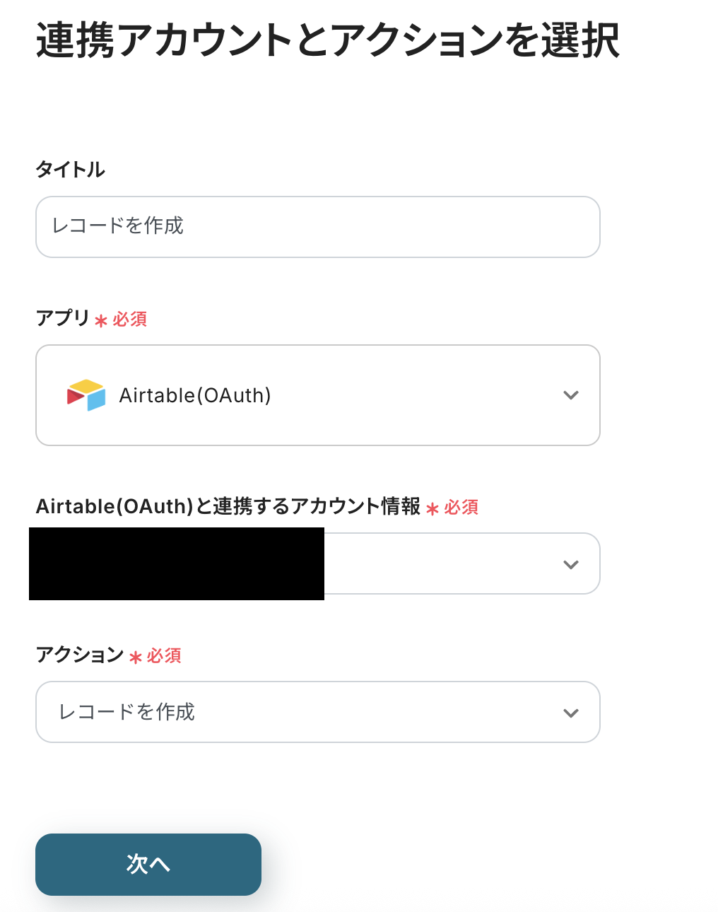 連携アカウントとアクションを選択の画面は設定を確認し、次へをクリックしましょう。