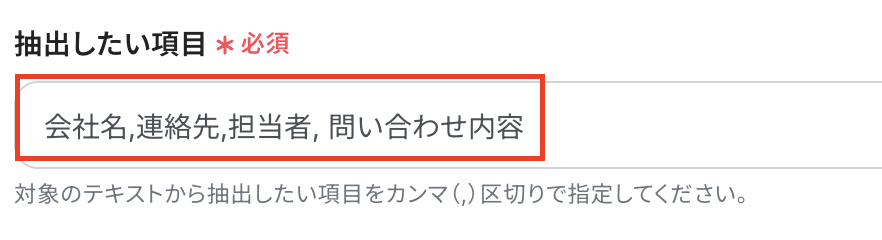 抽出したい項目には、値の間に半角コンマを入力し設定してください。
